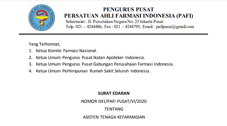 SURAT EDARAN NOMOR 041/PAFI SERENGAN/VI/2020 TENTANG ASISTEN TENAGA KEFARMASIAN